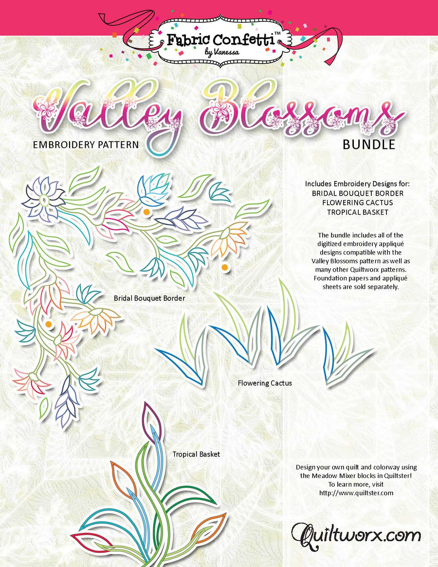 This pattern includes digitized embroidery applique designs compatible with the Quiltworx Valley Blossoms applique shapes. Foundation papers and applique sheets are sold separately.