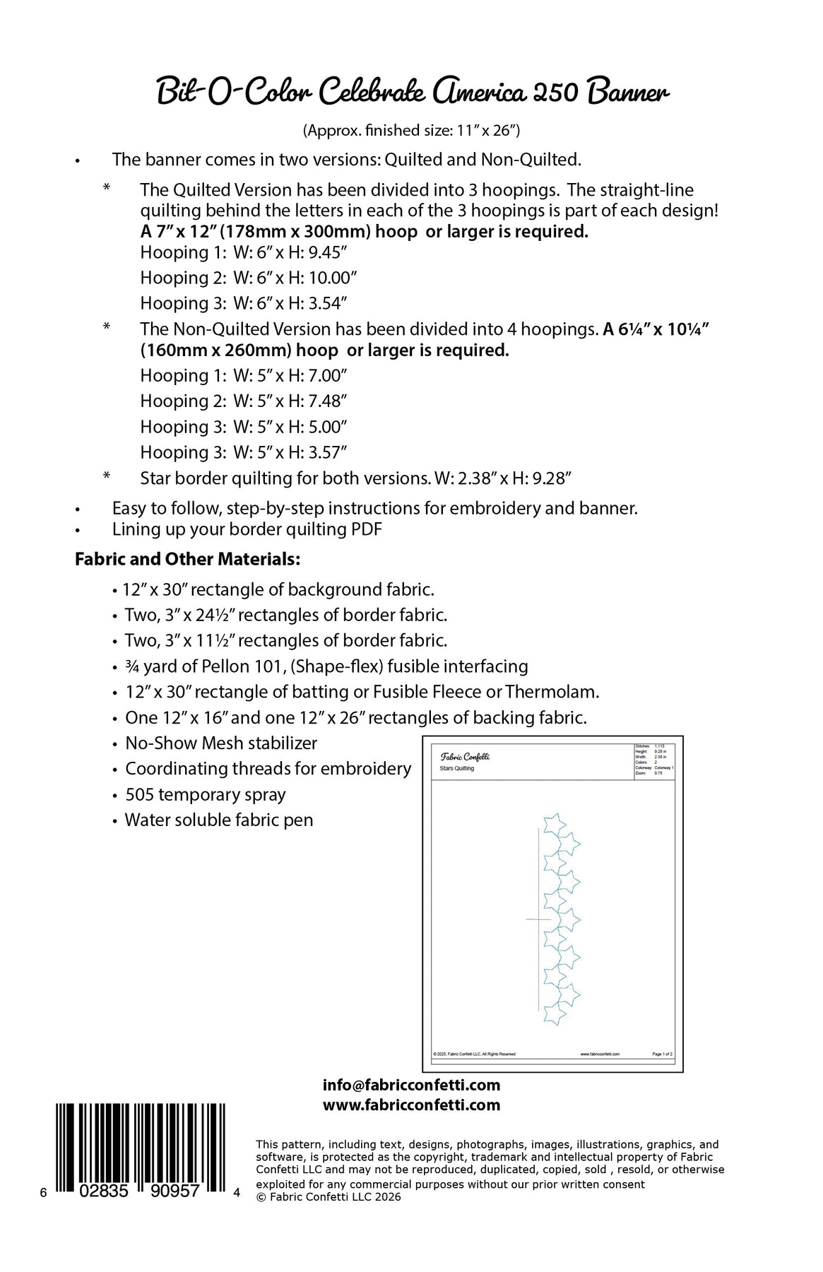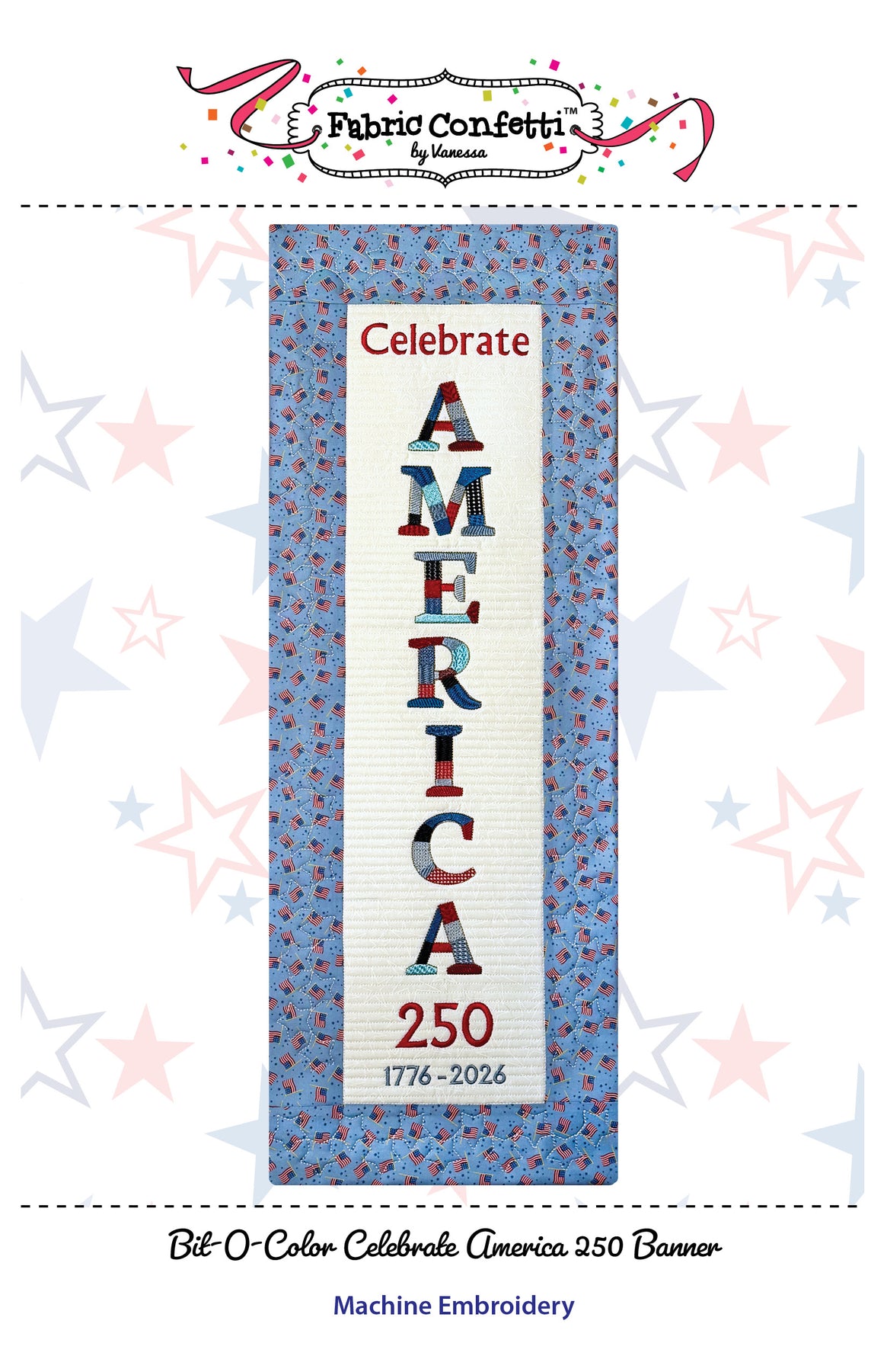 * Design files and instructions for the Bit-O-Color Celebrate America 250 Quilted banner, in the following formats: .dst, .emb, .exp, .hus, .jef, .pes, .vp3.